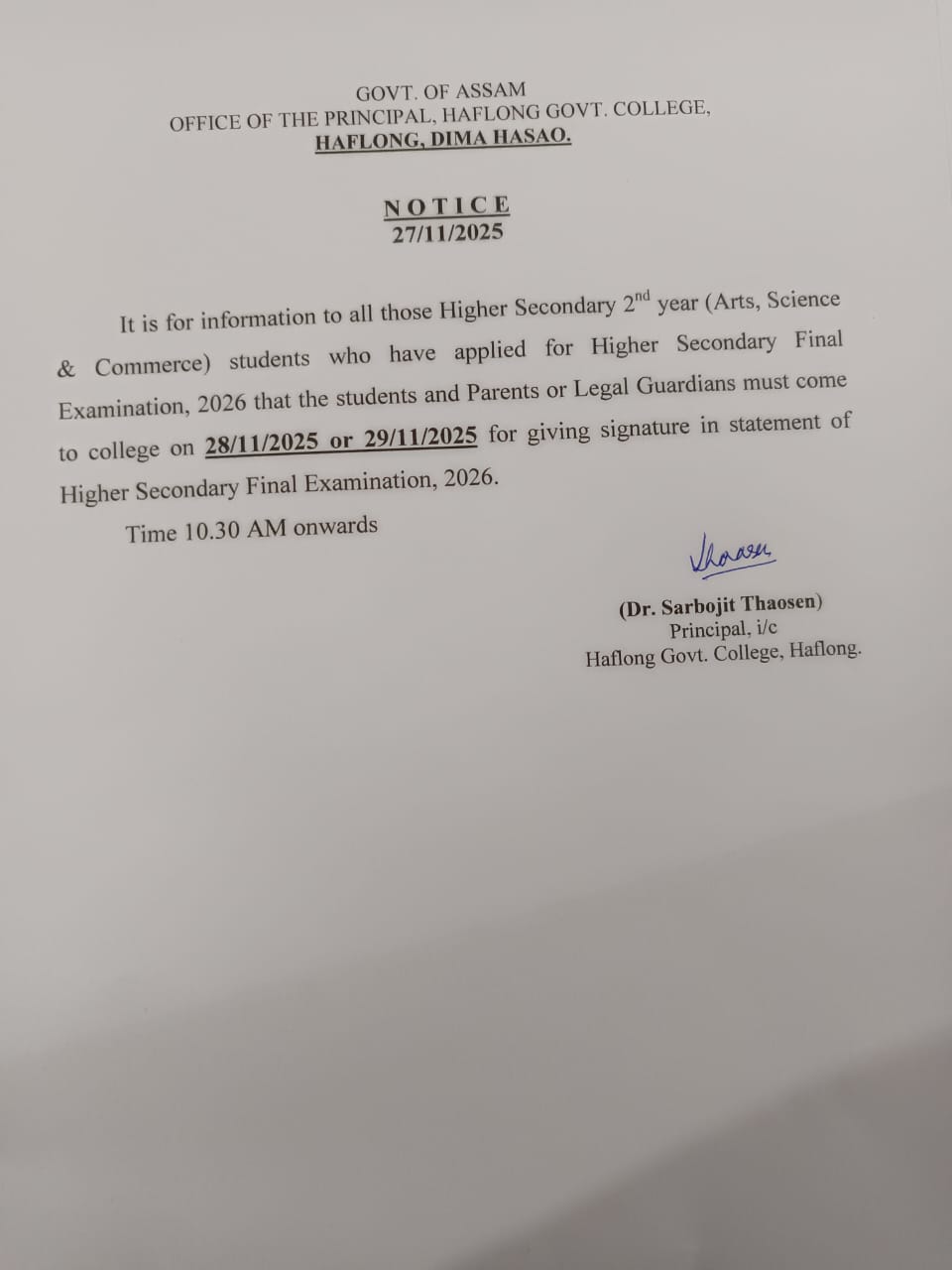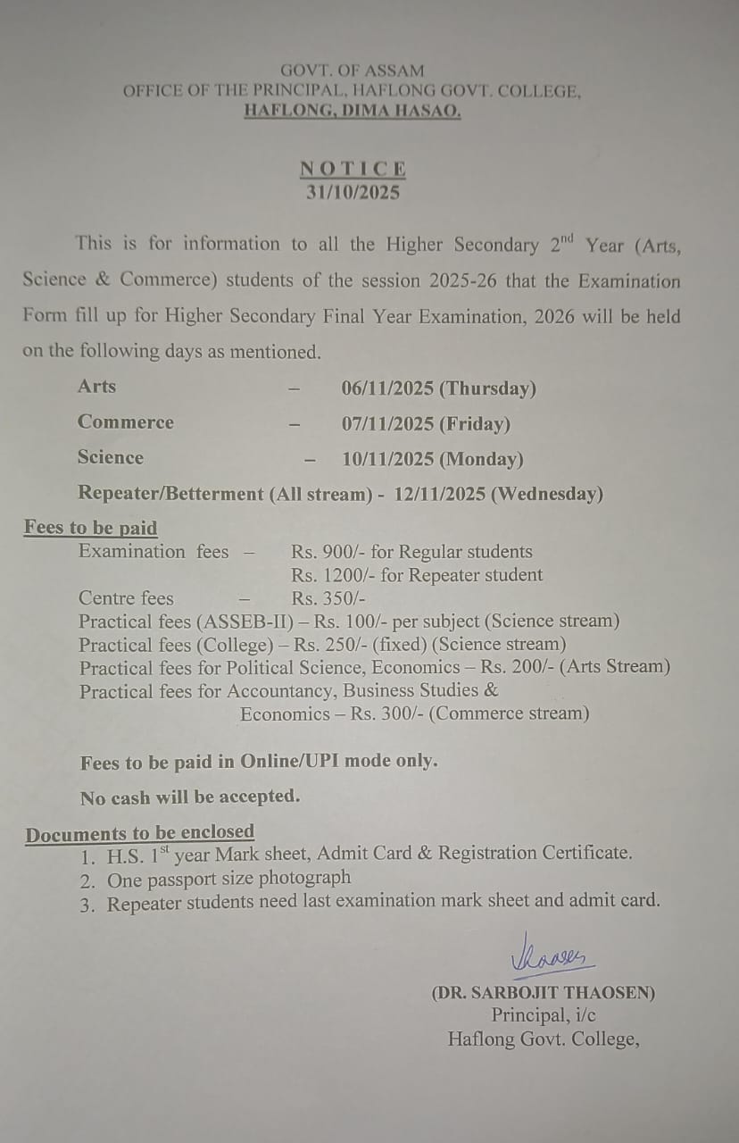 Revised Notice for Admission of FYUG 3rd & 5th Semester Arts, Science & Commerce, 2025-26    ||       Notice for Dr. Bani Kanta Kakati award 2024.    ||       Notice for Dr. Bani Kanta Kakati award 2024.    ||       HGC Admission for H S 1st Year ARTS, SCIENCE & COMMERCE for the Academic Session 2024-25 will be held on the following date. SCIENCE & COMMERCE - 27/05/2024 (Monday) ARTS     ||       Notification regarding FYUG 1st Semester Examination 2024, centre fees & Practical Fees collection Start From 22/02/2024 -24/02/2024    ||